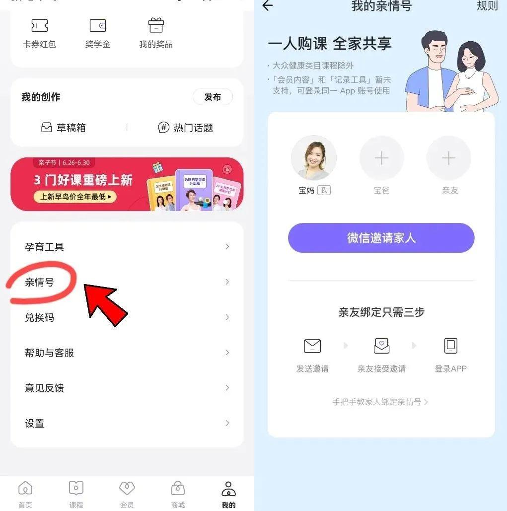 只需要邀請各位家庭成員綁定「親情賬號」,課程就能直接同步到他們的賬號中,跟着課程視頻就能學起來。點擊丁香媽媽 App - 我的 - 親情號即可綁定。