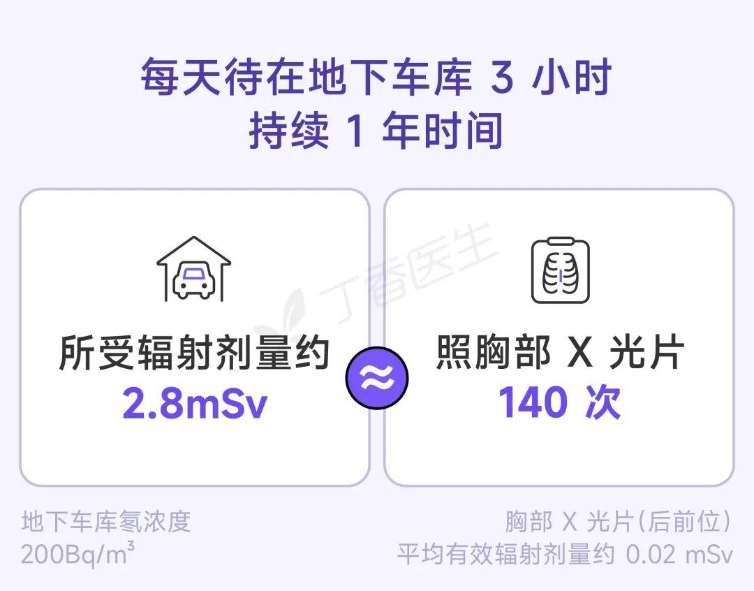 假設地下車庫的氡氣濃度在 200 Bq/m³ 左右(小區常見中間值),一個人每天在地下車庫唱歌或跳舞待 3 個小時,再按照《氡及其子體個人劑量監測方法》中室內工作場所 1.3 x 10-5mSv/Bq-3·m·h 的係數轉換[3],結果發現——