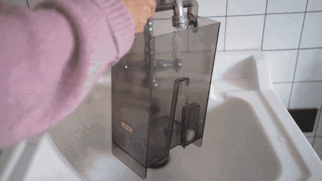 機器自帶一個4.5 L的大容量原水箱,你每天只需要像給加溼器加水一樣,把它拿到水龍頭下接滿自來水,再放回機器上,剩下的就交給它。