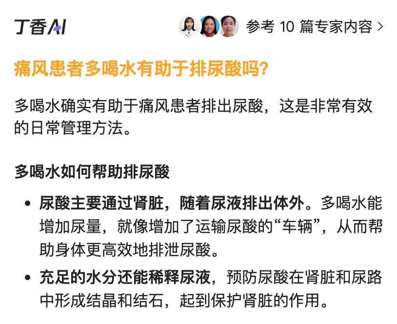 今日回答後臺提問:家人痛風,多喝水有助於排尿酸嗎?關於「痛風、尿酸」,有任何的疑問都可以直接上「丁香醫生 App/小程序」查,一查就有靠譜的醫學解答。