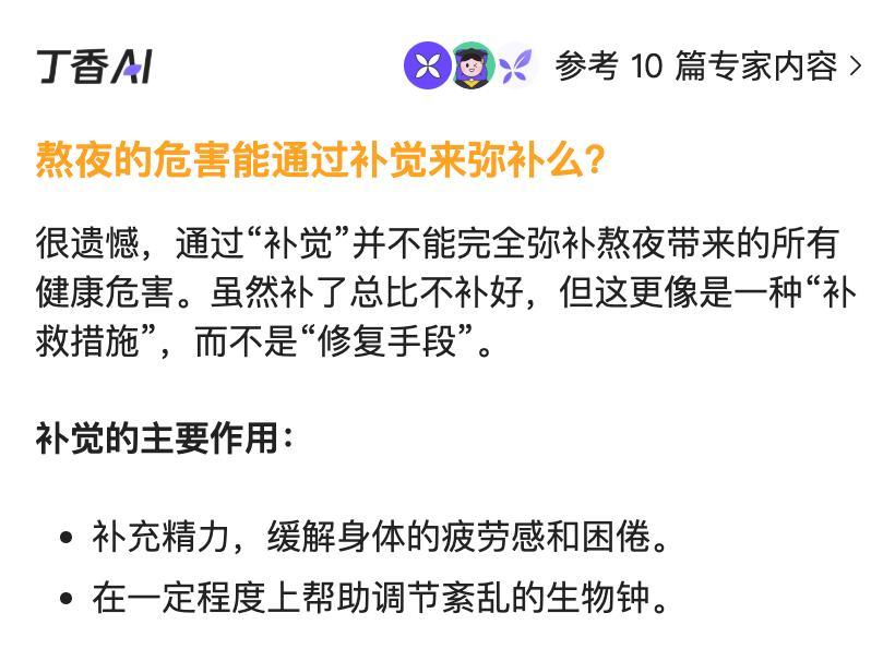 今日回答後臺提問:熬夜的危害能用補覺彌補嗎?關於「熬夜」,有任何的疑問都可以直接上「丁香醫生 App/小程序」免費查,一查就有靠譜的醫學解答。