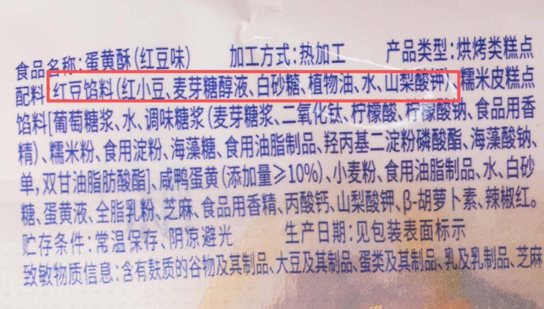 工藝上要想起酥好,糖、油少不了。不行,你看傳統的蛋黃酥配料表: