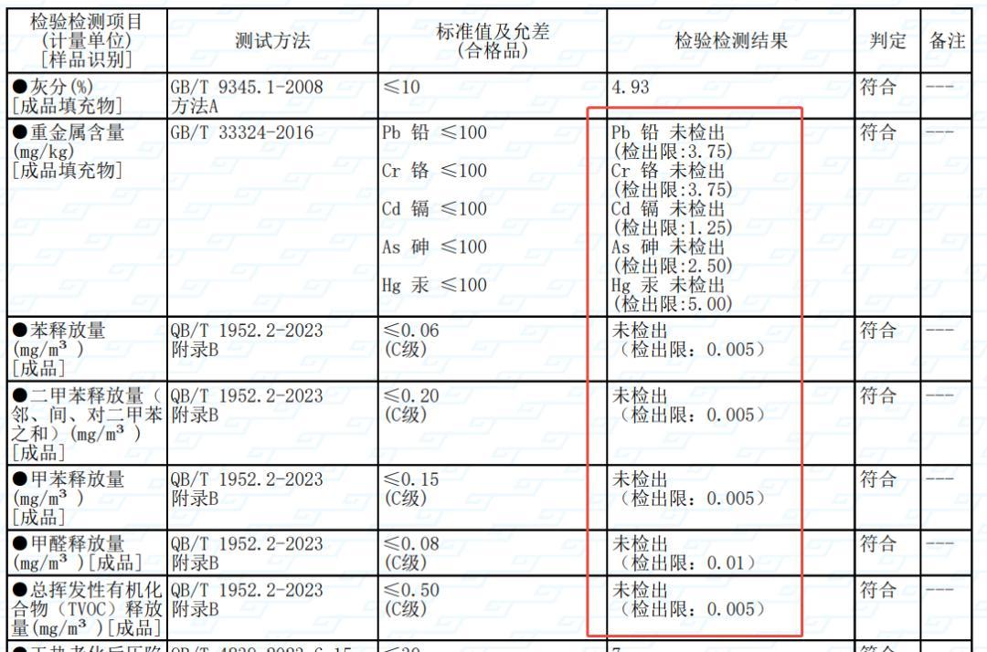 在安全性方面,它有一系列專業檢測報告,證明它的安全實力,天然抑菌防蟎,重金屬、甲醛、苯等檢測均符合標準!