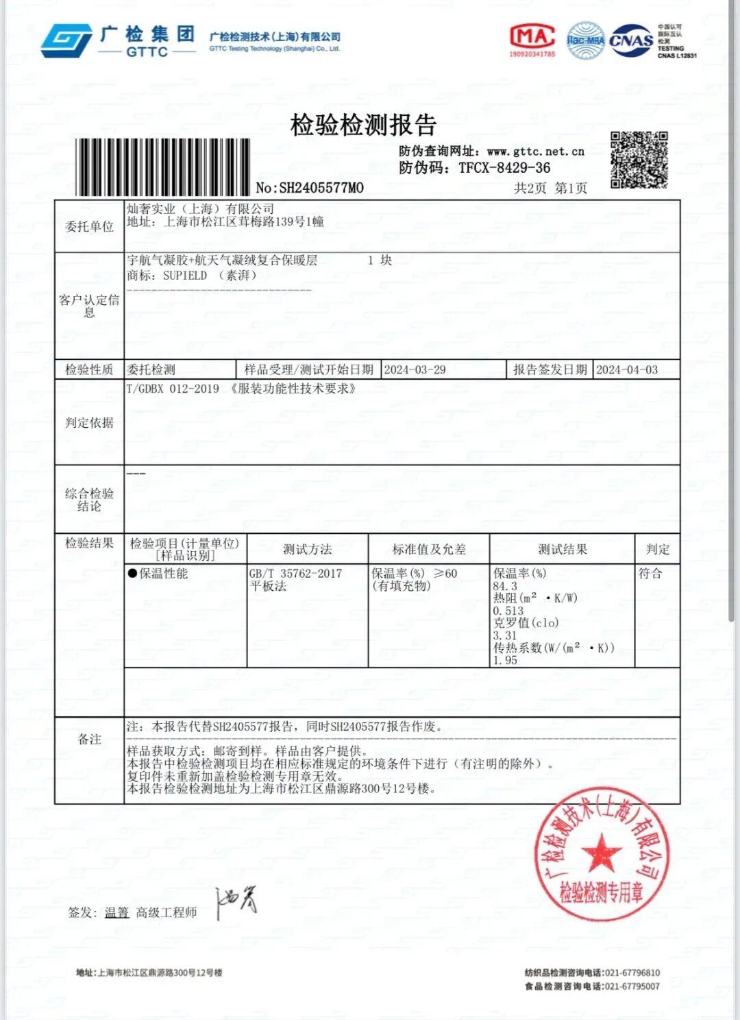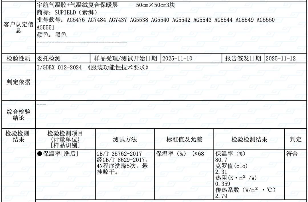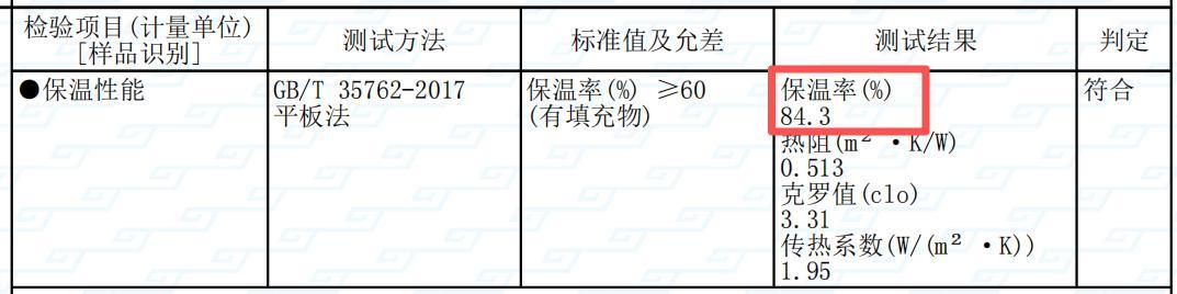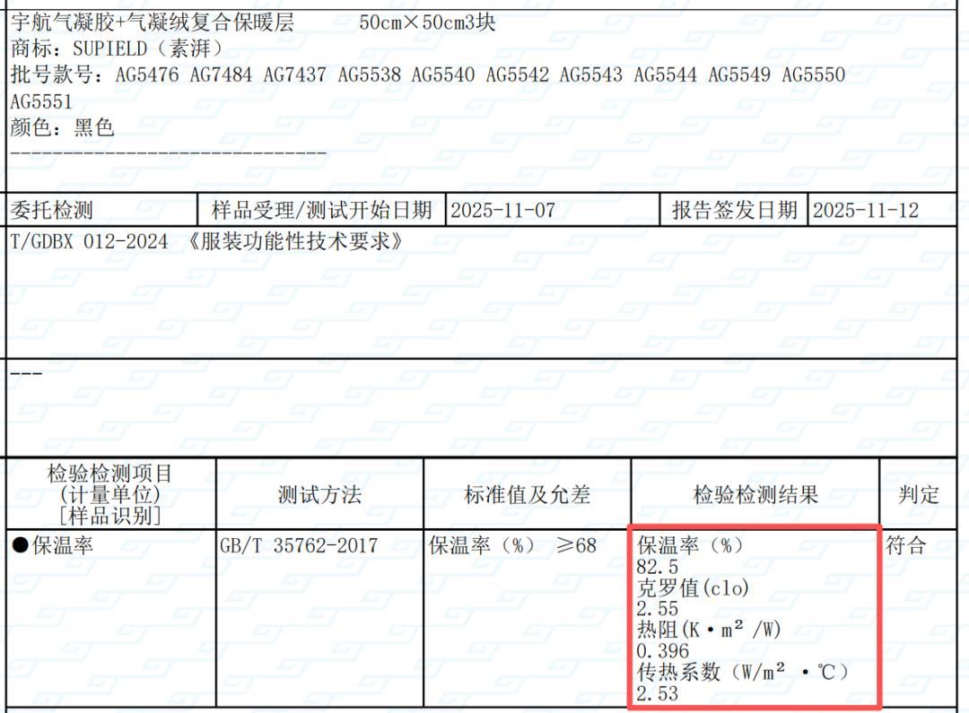 咱開團的這款抗寒服:聚酰亞胺纖維(氣凝絨)和氣凝膠複合保暖層檢測出的保溫率高達 84.3%,克羅值 3.31,遠超標準值!