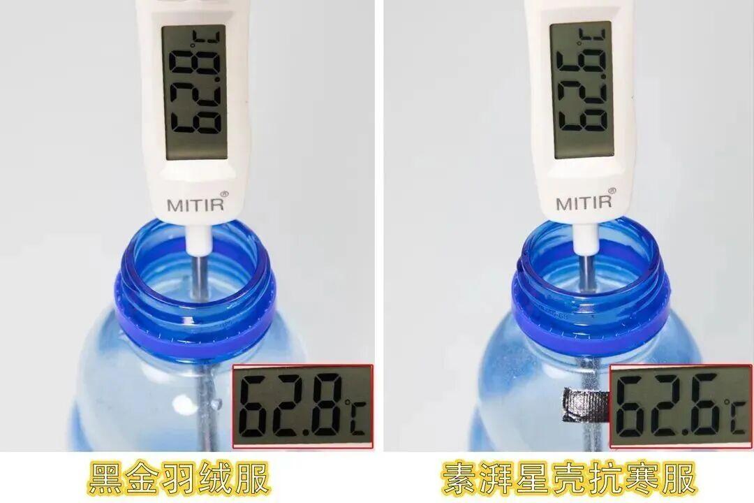 我們做了更直觀的實驗:把兩瓶同樣 62 ℃ 的水分別裹進 600 蓬鬆度的普通 90 絨的羽絨服和星殼抗寒服中,同時放入冰箱冷藏室;
