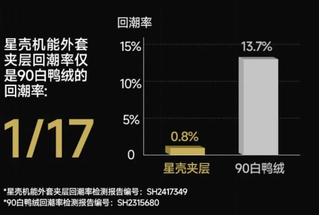 0.8% 的回潮率意味着它不容易吸水,在潮溼環境下依然能保持乾燥、保暖,不用擔心衣服「吸了潮氣反而更冷」。