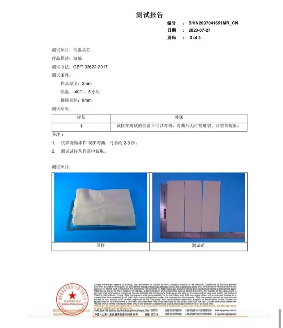保暖複合材料的低溫柔性測試也通過了,即便是低溫(零下 40 度)5 小時後,180° 彎曲也沒有出現破裂、開裂的現象。