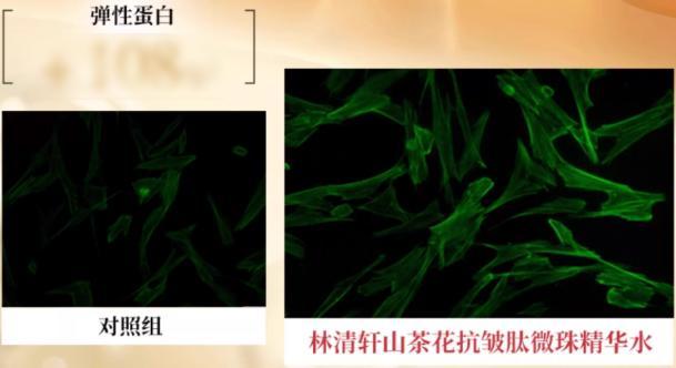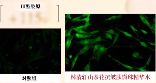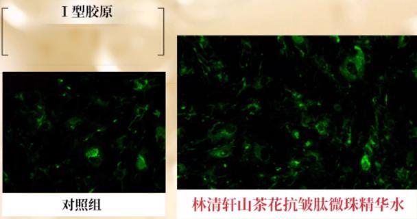在它的助力下,據體外實驗可以看到:使用林清軒山茶花抗皺肽微珠精華水組的 Ⅰ型、Ⅲ 型、ⅩⅦ 型膠原蛋白及彈性蛋白平均熒光強度與模型對照組相比,均顯著上調(*體外實驗,不代表產品人體功效)