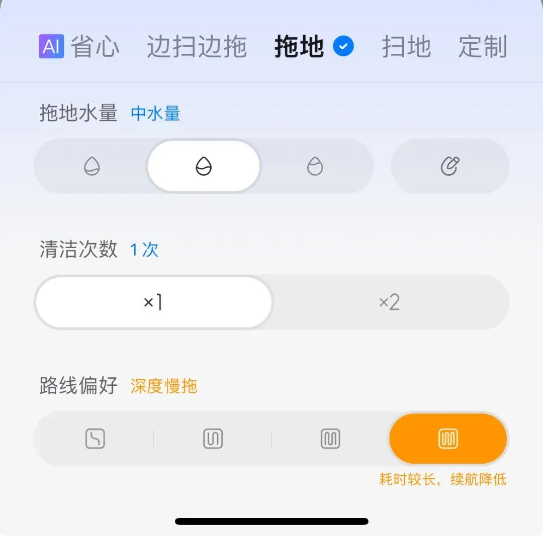 咱還能自己在 App 上設置清潔次數和拖地水量,地面特別髒時,就加大水量,地面不髒時甚至可以自定義水量,或者只掃不拖。