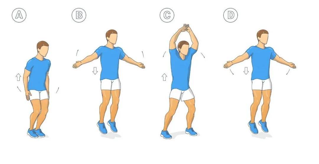 站立時雙腳併攏,跳起時雙腳向兩側打開,略寬於肩,同時雙手從體側向上舉至頭頂;再次跳起時恢復起始姿勢。