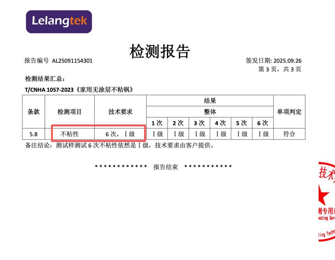 經檢測,不粘性能符合國標 I 級不粘標準!