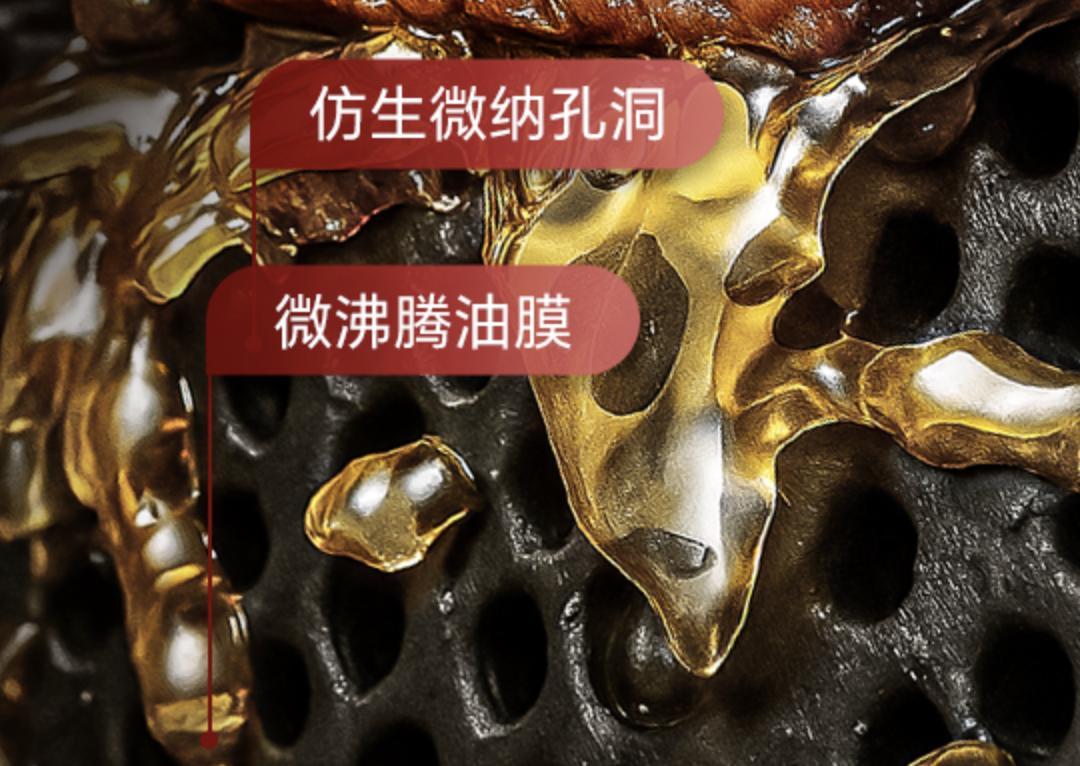 這是因爲它採用了仿生微納孔洞不粘技術,你可以想象它的表面有無數個均勻排列的微細小孔,就像一塊超級細膩的海綿。熱鍋倒油時,這些孔隙會快速、均勻地吸附油脂,瞬間形成一層天然油膜。