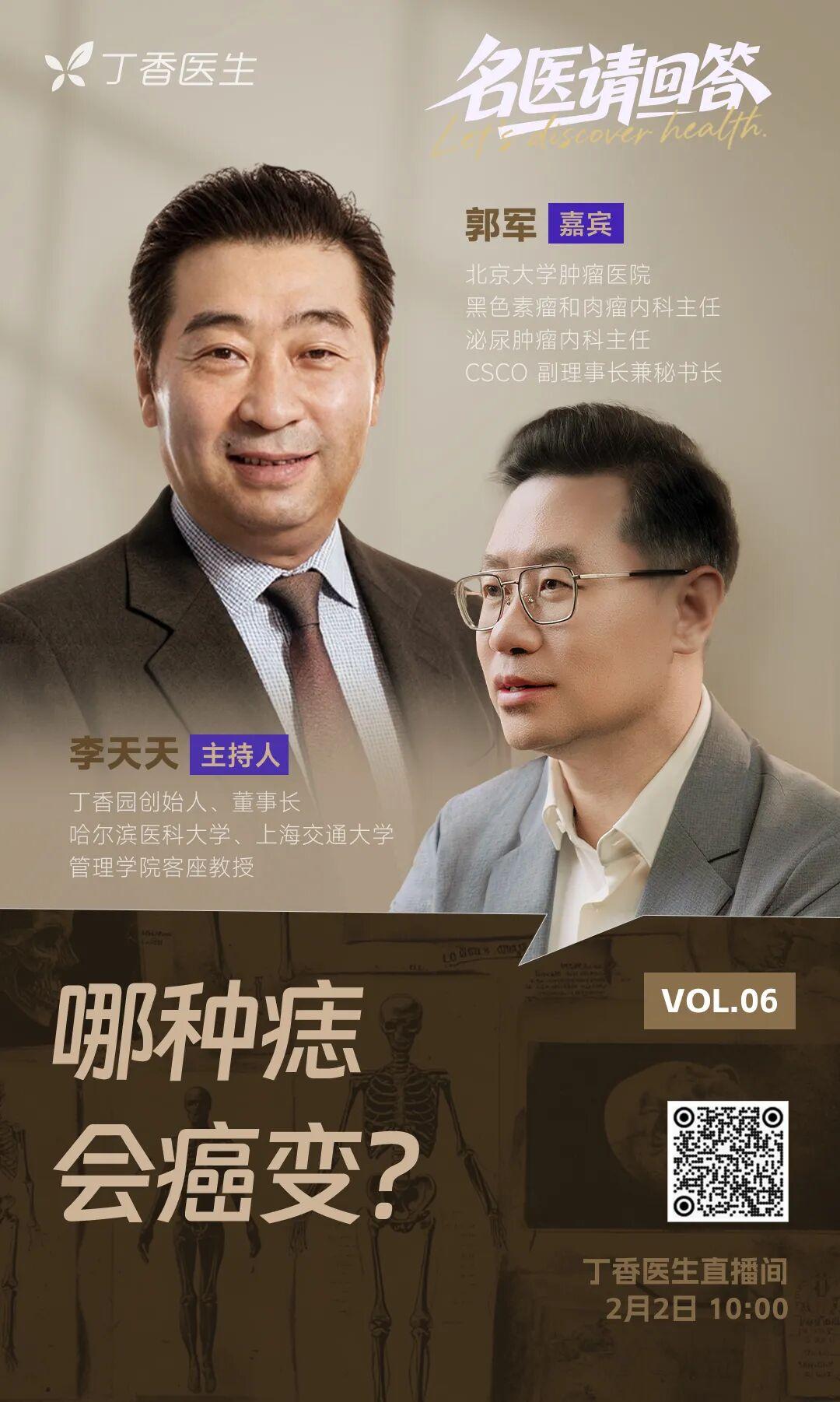 黑色素瘤治療療領域的頂級專家、北京大學腫瘤醫院黑色素瘤和肉瘤內科主任、泌尿腫瘤內科主任、中國臨牀腫瘤學會副理事長兼祕書長 郭軍教授,做客丁香醫生直播間的品牌欄目《名醫請回答》,爲您解答: