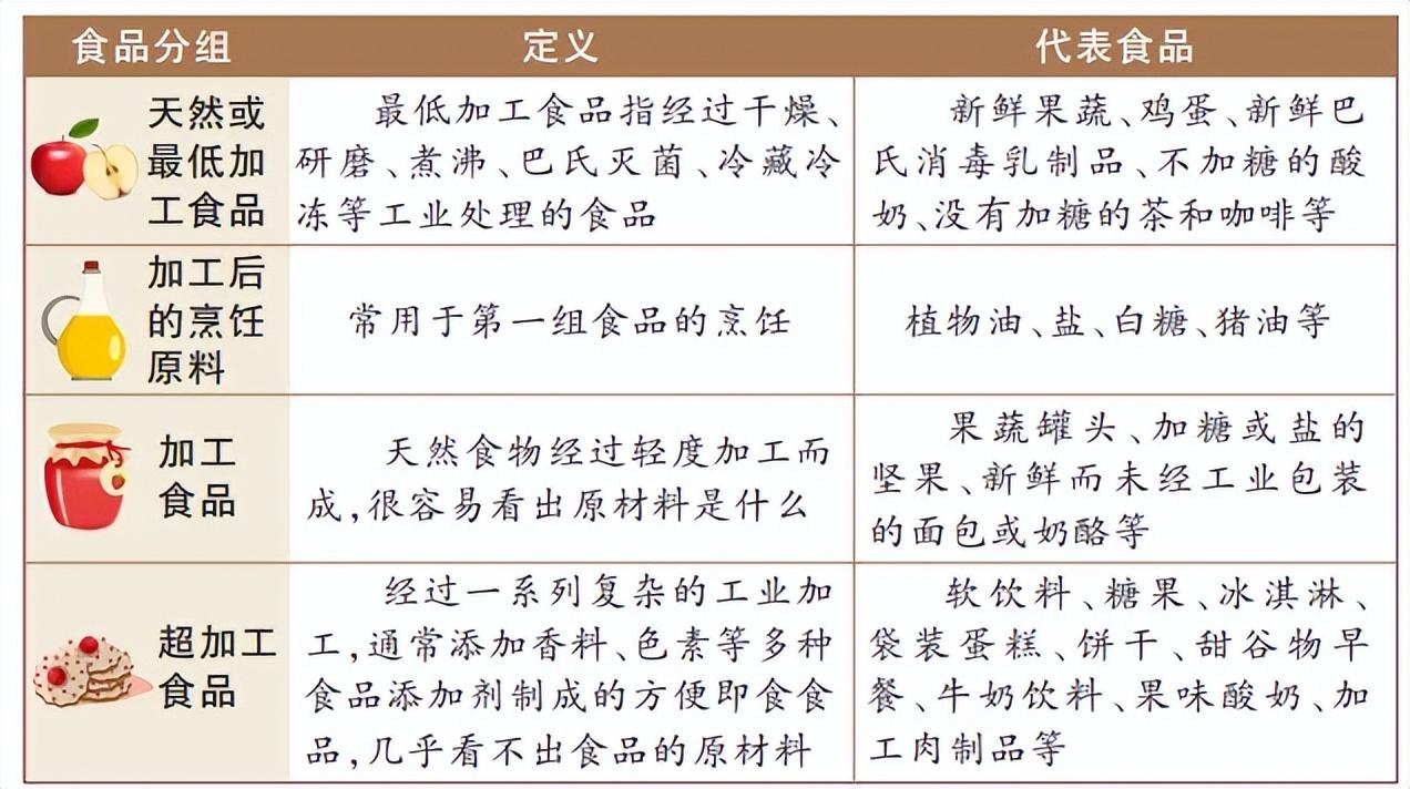 超加工食品到底包括哪些食物?全球最全面、應用範圍最廣泛的飲食分類系統NOVA,根據加工程度,將食品分爲四大類(見下表)。