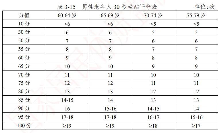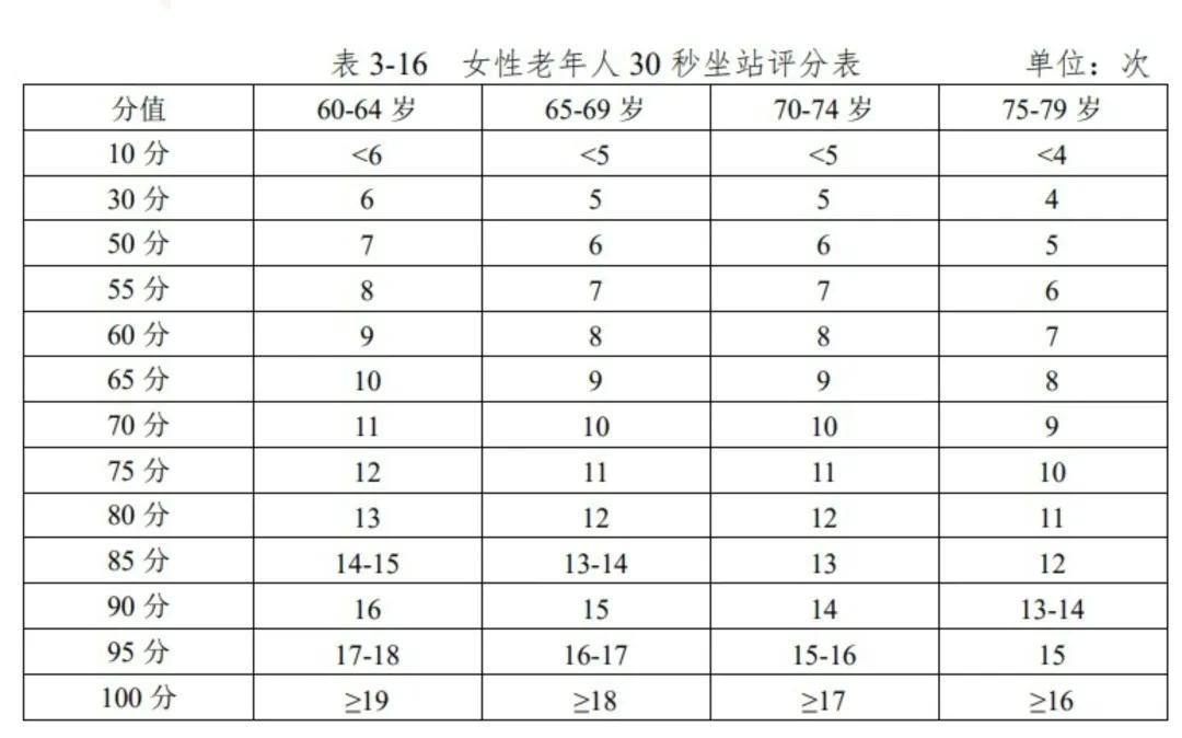 《國民體質測定標準(2023 年修訂)》中,30秒坐站測試被列入60~79週歲的老年人測試項目,可對照自查。