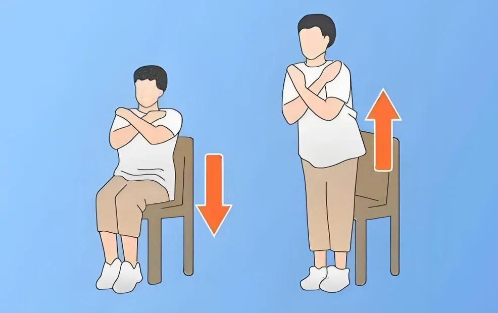 動作要領:坐在高度40釐米左右、穩定的椅子上,保持背部挺直,雙手交叉於胸前;起身至完全站立,然後恢復到完全坐姿狀態算一次,記錄1分鐘內的完成次數。