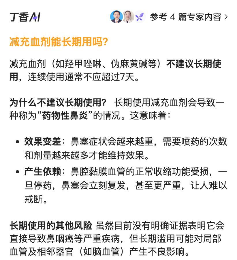 如果使用減充血劑(比如羥甲唑啉噴霧劑),注意最好不連續用超過一週,不建議長期使用。關於「鼻炎」,有任何的疑問都可以直接上「丁香醫生 App/」免費查,一查就有靠譜的醫學解答。