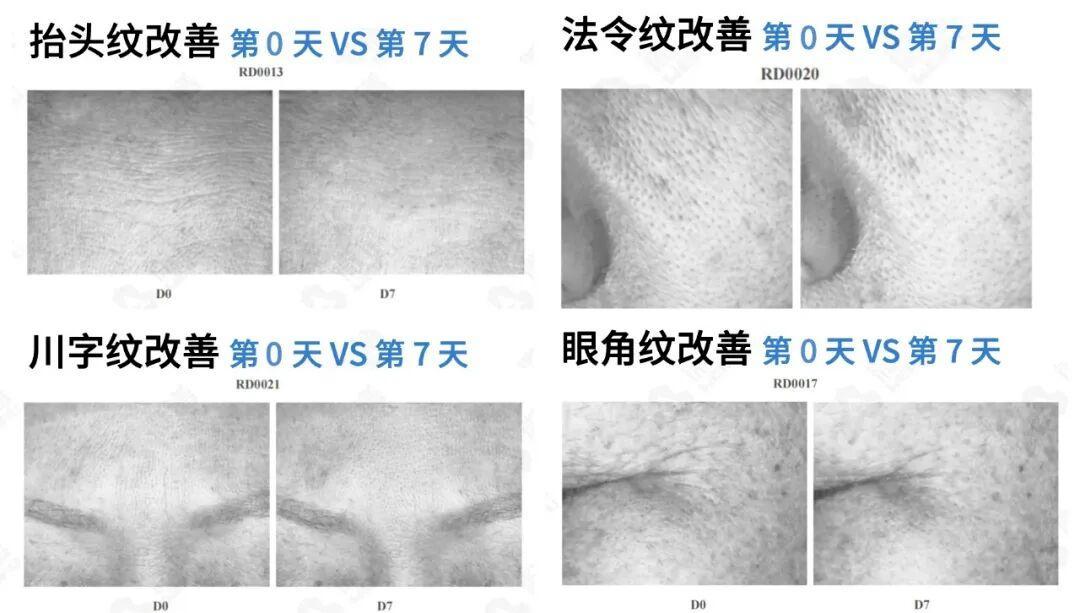 報告顯示:受試者使用 7 天后,肉眼可見原本臉上表皮和真皮淺層的頑固幹紋、細紋,如抬頭紋、川字紋、法令紋、眼角皺紋,就像被潤開了一樣,明顯變淡了!