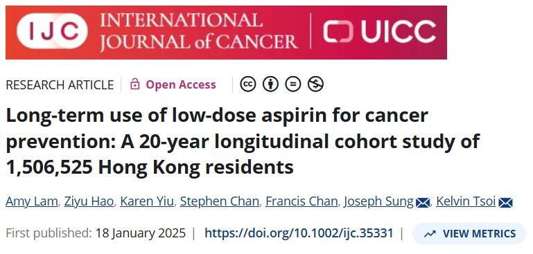 [2] Lam A, Hao Z, Yiu K, Chan S, Chan F, Sung J, Tsoi K. Long-term use of low-dose aspirin for cancer prevention: A 20-year longitudinal cohort study of 1,506,525 Hong Kong residents. Int J Cancer. 2025 Jun 15;156(12):2330-2339.