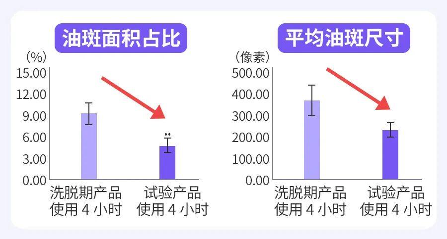 咱們又做了一個實驗,在使用康王洗髮水 4 周後,將康王洗髮水換成了「不含去屑和舒緩成分」的基礎洗髮水,發現:即使停用 2 周以後,頭屑依然在持續減少,油斑面積佔比也在持續減小!