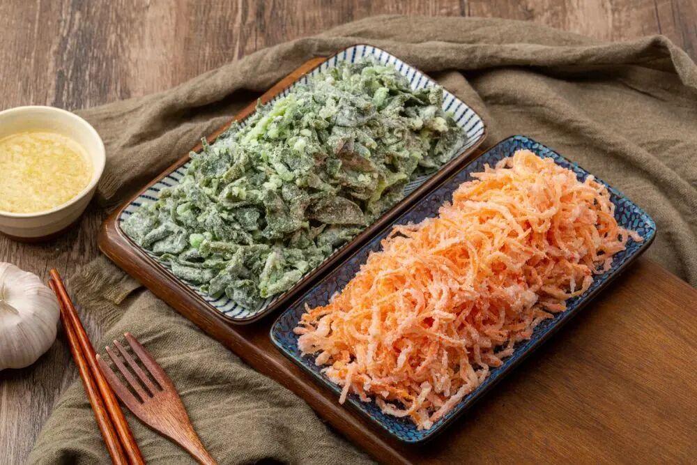 在河南,茼蒿、胡蘿蔔、紅薯葉、萵筍葉……萬菜皆可裹面蒸,拌上蒜汁嘎嘎香。