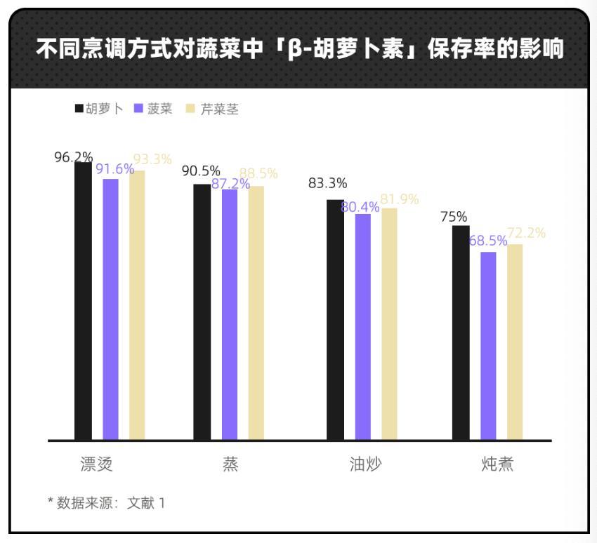 研究發現,蒸、漂燙對胡蘿蔔、菠菜、番茄等蔬菜中 β-胡蘿蔔素的保存率能達到 87% 以上。而油炒和燉煮的保存效果,明顯要弱。