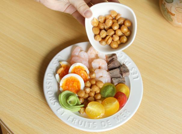正餐也可以嘗試做頓鷹嘴豆波奇碗——大蝦、番茄、牛油果,搭配上溏心蛋,最後撒上一把鷹嘴豆,營養直接上一個檔次!