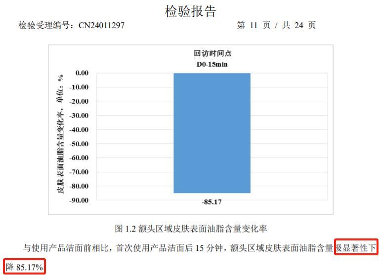 15 min 後前額皮膚油脂含量降低 85.17%