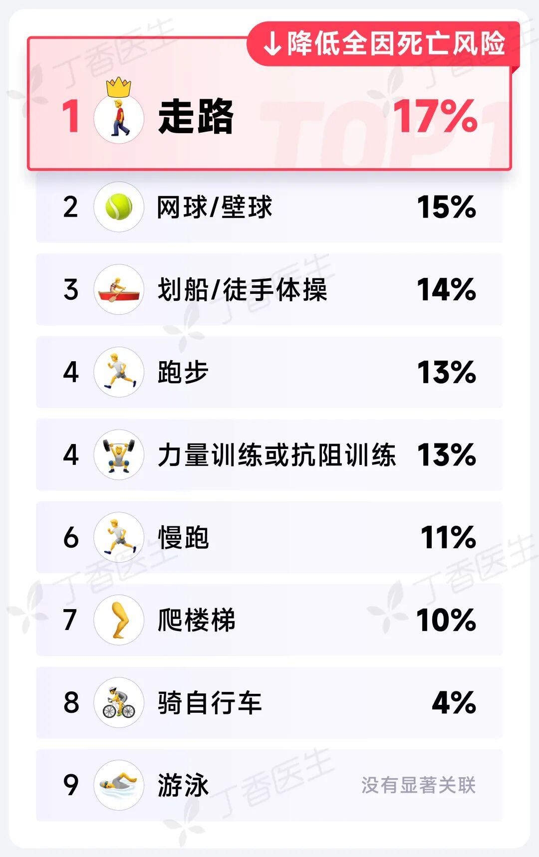 在 9 項運動中,走路「打敗」跑步、游泳等運動,降低全因死亡風險 17%,排名第一。[1]