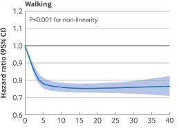 研究發現,走路對全因死亡風險的降低作用在 7.5 MET-hours/week 左右就達到平臺期。