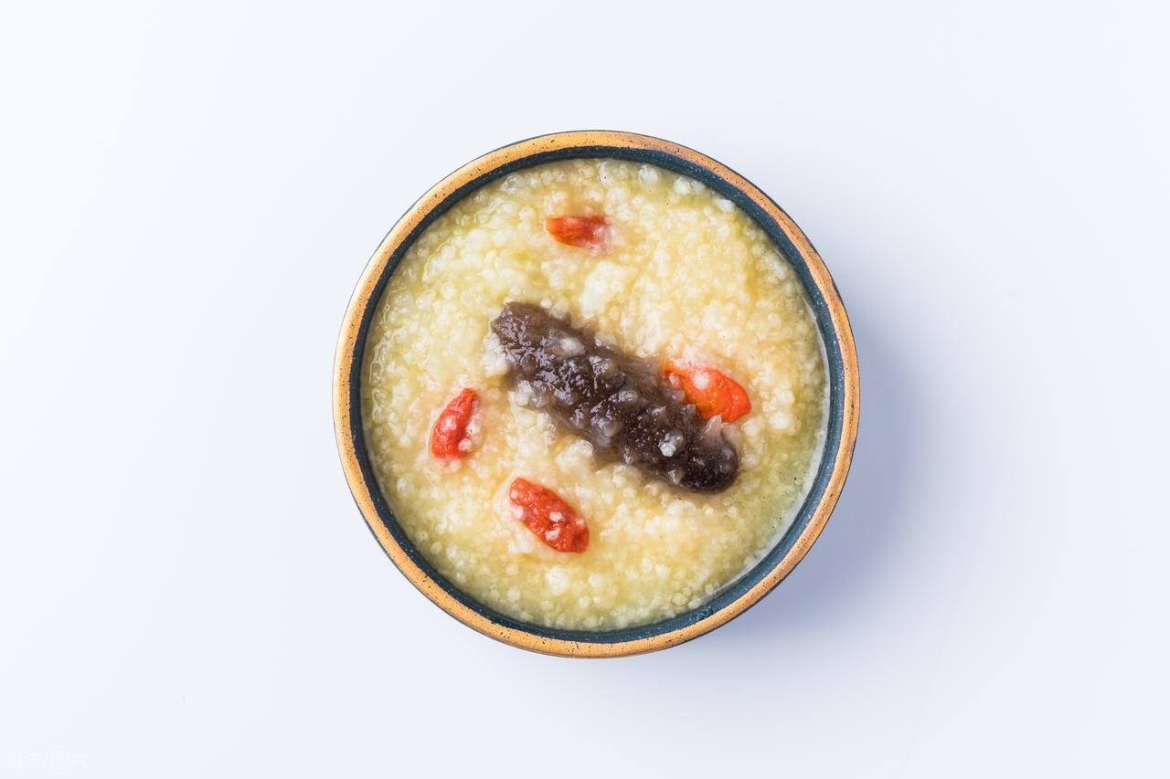 操作步驟:小米洗淨浸泡30分鐘,加水煮沸後轉小火煮30分鐘至濃稠;海蔘焯水後切小塊,與薑片、枸杞一同放入粥中,繼續煮10分鐘,加鹽調味即可。