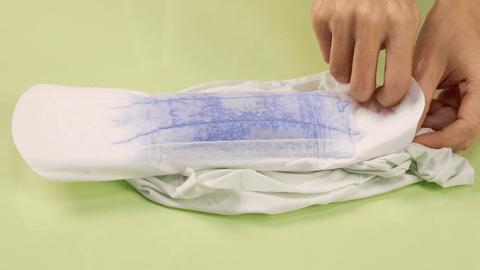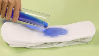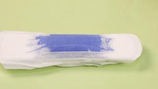 我們測試時直接將一管藍色的水倒在衛生巾上,能明顯看到,水直接被牢牢鎖在了衛生巾裏。