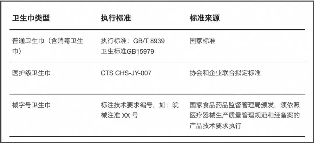 市面上關於衛生巾品類的標準對比,數據來源:參考文獻[2-4]