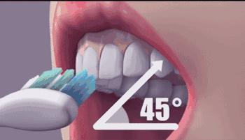 - 刷門牙內側:同樣成45度角斜放上排牙齒向下,下排牙齒向上提拉輕刷。