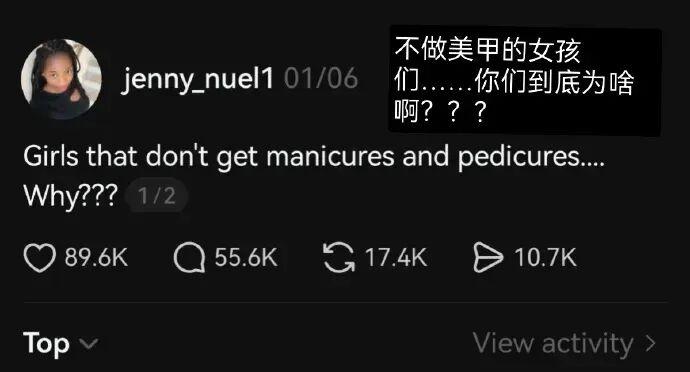 前陣子,一個叫珍妮的女孩在網上發問,「爲啥會有女生不做美甲啊?」很快,她收到了各種各樣的回覆: