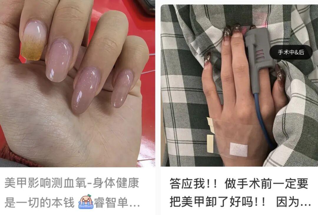哪怕不是麻醉手術,很多醫生也會更建議大家平時:少做美甲,實在要做,至少保留一個乾淨手指(食指、中指或無名指),且最好別做深色、過厚的帶鑽指甲。