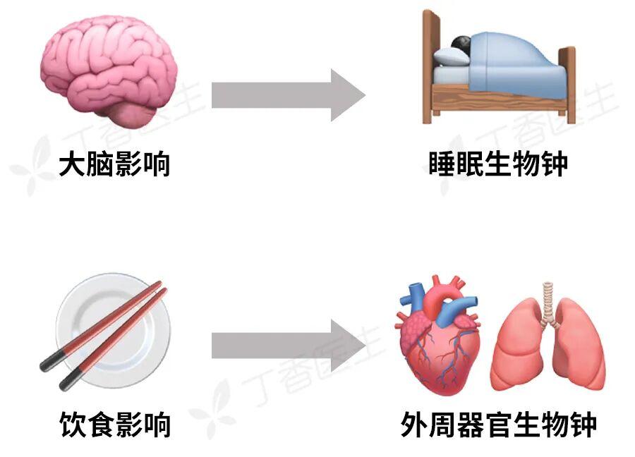 簡單地說,人體的晝夜節律其實可以分兩套系統:不僅由大腦的中樞生物鐘調控,同時也受外周器官(比如胃腸道)生物鐘的調節。[7]