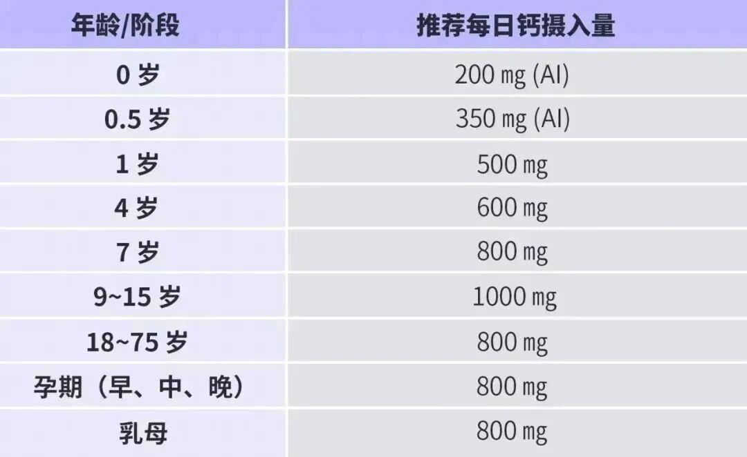 根據《中國居民膳食營養素參考攝入量( 2023 版)》推薦,每日鈣攝入量有這麼多: