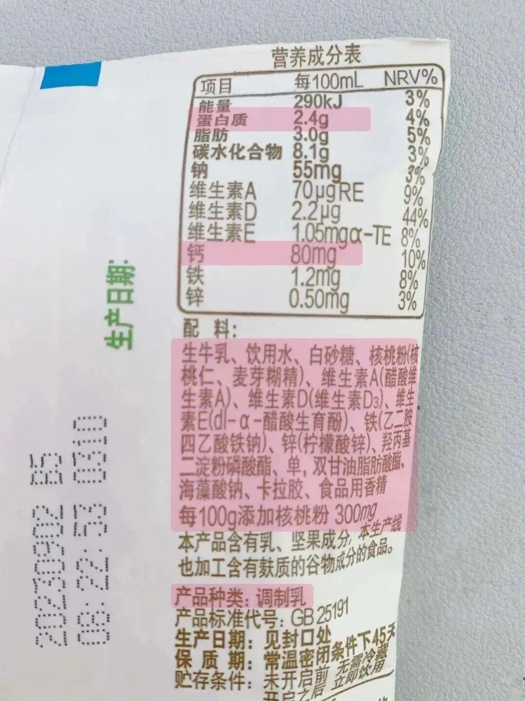 隨手拍了某核桃牛奶,第一位雖然是生牛乳,但只是屬於「調製乳」,還摻了白砂糖。