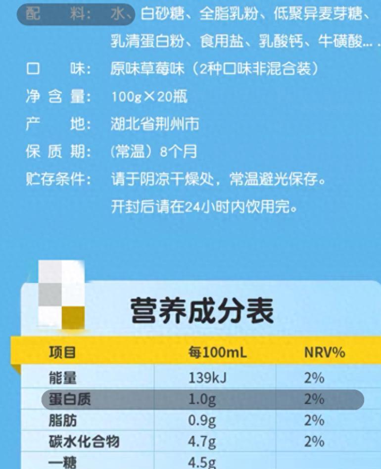 你看這款草莓味牛奶,排在第一位的是「水」,第二位白砂糖,蛋白質更是少得可憐。別再叫它牛奶了好嗎,它只是含乳飲料~