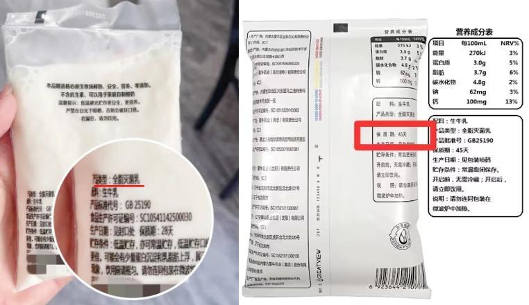 比如下面這種透明包裝的牛奶雖然保質期只有 28 天,右邊利樂枕包裝的保質期只有 45 天,但它們還就是「滅菌乳」 [1]。