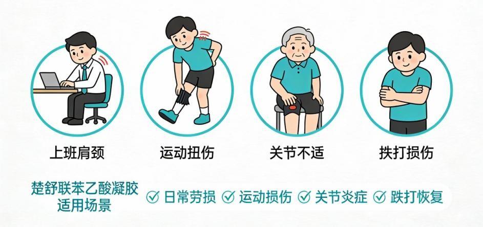 楚舒聯苯乙酸凝膠,屬於臨牀常用的非甾體抗炎外用凝膠,可以通過皮膚滲透,直達炎症部位,抑制前列腺素合成,從源頭打斷“炎症→疼痛”的循環。