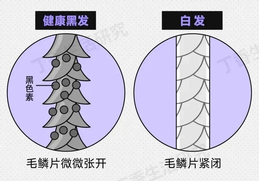 相對於健康的黑髮,白髮裏面沒有色素,外面毛鱗片比較緊閉,人工染料不容易進入頭髮內部。