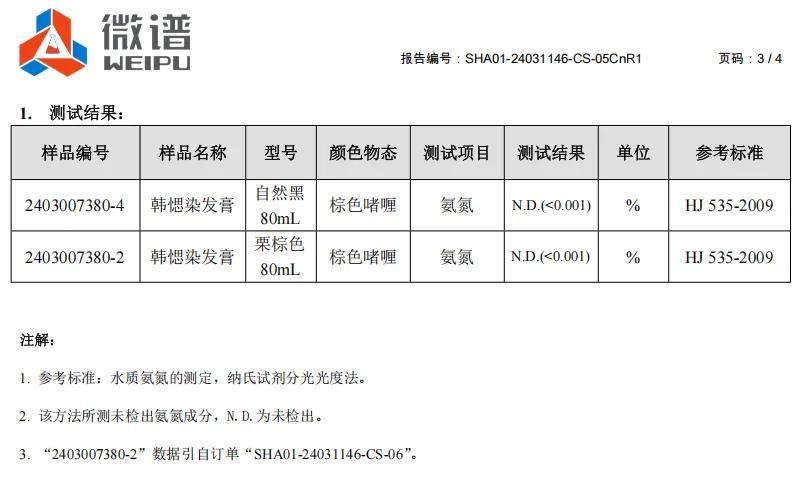 實打實做了氨水含量的檢測,報告顯示:氨氮含量 < 0.001%