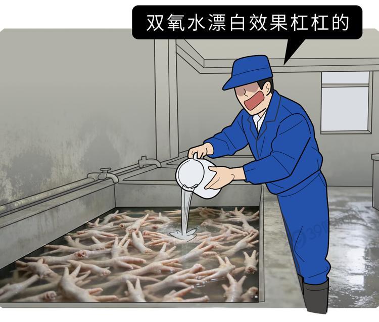 而爲了讓雞爪賣相更好看,還用雙氧水(過氧化氫)浸泡。雙氧水具有強氧化性,能腐蝕表皮,讓鳳爪瞬間“美白”,呈現出一種病態的慘白。