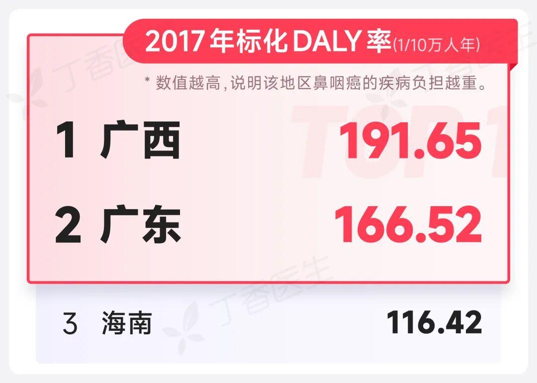 2017 年,中國鼻咽癌負擔最重省份前三名分別是:廣西壯族自治區、廣東省、海南省。[2]