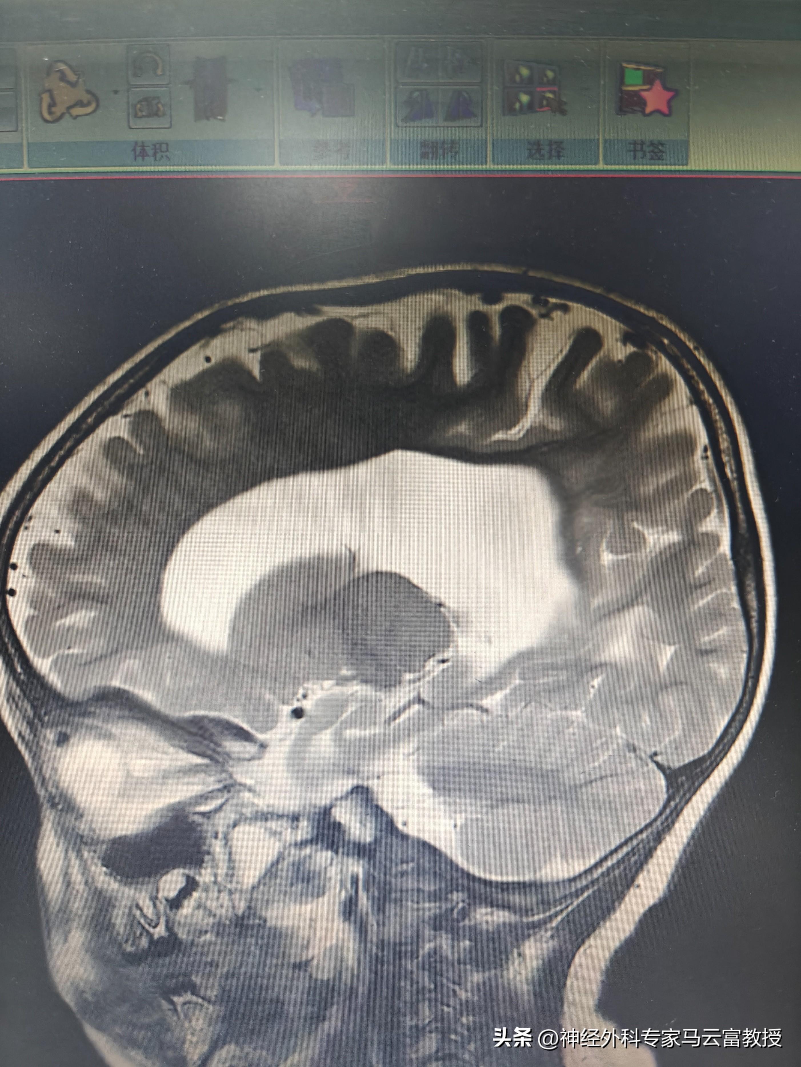 孩子頭圍已達57cm(遠超同齡正常水平),發育也明顯滯後,目前僅能發出 “爸爸”“媽媽” 的簡單音節。在當地醫院檢查時,醫生髮現寶寶側腦室正在逐漸增寬,建議立即轉診至我院進一步診治。