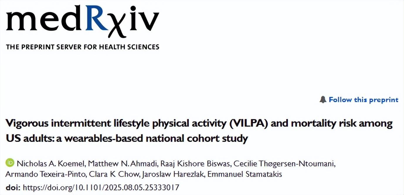 [1] Nicholas A. Koemel, Matthew N. Ahmadi, Raaj Kishore Biswas, Cecilie Thøgersen-Ntoumani, Armando Texeira-Pinto, Clara K Chow, Jaroslaw Harezlak, Emmanuel Stamatakis.Vigorous intermittent lifestyle physical activity (VILPA) and mortality risk among US adults: a wearables-based national cohort study.medRxiv. 2025.08.05.25333017