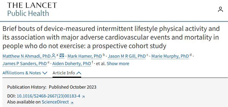 [2] Ahmadi M, Hamer M, Gill J et al.Brief bouts of device-measured intermittent lifestyle physical activity and its association with major adverse cardiovascular events and mortality in people who do not exercise: a prospective cohort study.The Lancet Public Health, 8, e800-e810
