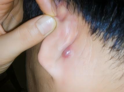 一開始,你可能只是感到耳後有點疼痛,然後慢慢的,它會變成一個紅、腫、痛的小硬結,並且越長越大,幾天後中心處會出現黃白色的膿栓。